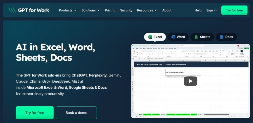 GPT for Work 是一款由 Talarian 开发的 AI 工具,专为 Microsoft Excel、Word、Google Sheets 和 Google Docs 设计。它利用先进的 AI 模型(如 ChatGPT),帮助用户在处理大量数据和文档时实现自动化和批量操作,从而显著提高工作效率。