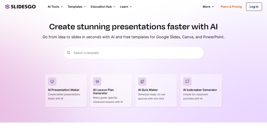 Slidesgo 是一个提供大量免费和付费模板的在线工具,专门用于创建演示文稿。它支持 Google Slides 和 Microsoft PowerPoint 格式,旨在帮助用户快速设计出既专业又有吸引力的演示文稿。Slidesgo 的模板涵盖了商业、教育、医疗、营销等多个领域,以及各种风格和主题,满足不同用户的需求。