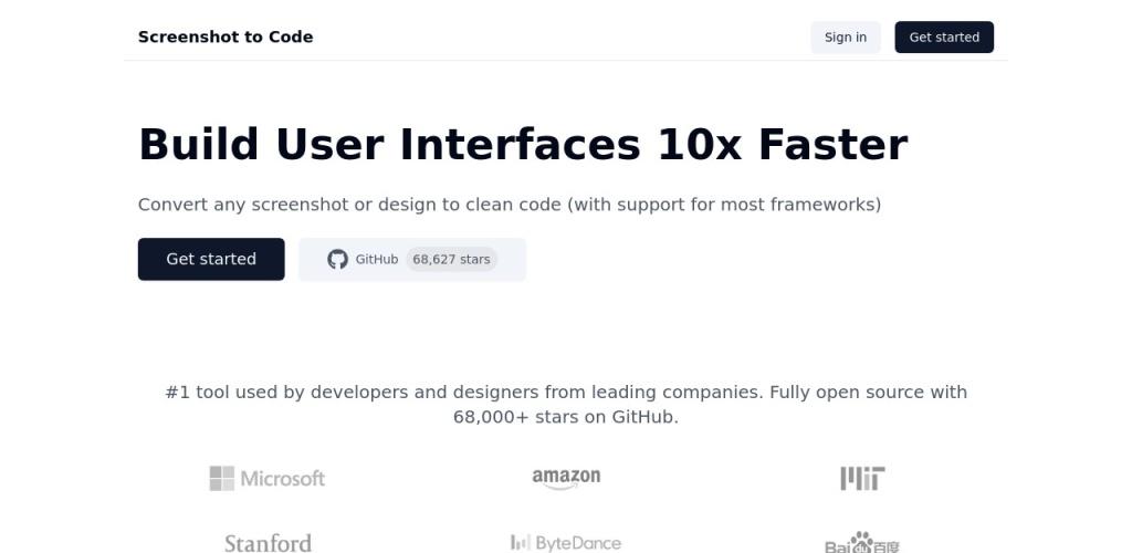 “Screenshot to Code” 网站可将截图或设计转换为简洁代码(支持大多数框架),能让用户界面构建速度快 10 倍。该网站在 GitHub 上获 53939 颗星,是领先公司的开发者和设计师使用的排名第一的工具,且完全开源。网站上还展示了微软、亚马逊、斯坦福、字节跳动、百度等用户的评价。
