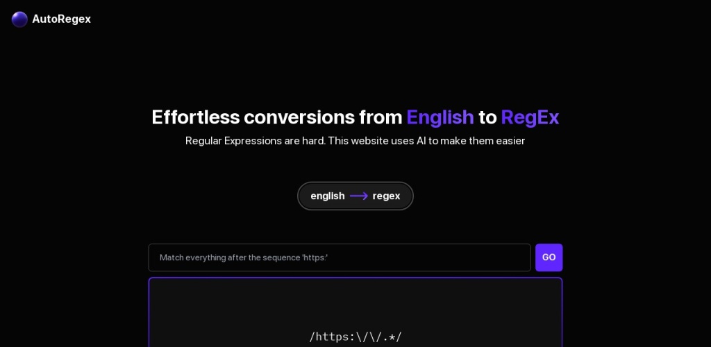 该网站(https://www.autoregex.xyz/)提供了从英语到正则表达式(RegEx)的轻松转换功能,提到正则表达式较难,而此网站利用人工智能使其变得更容易。