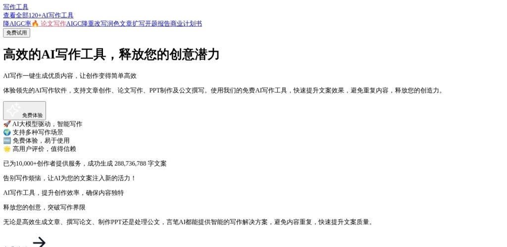 言笔AI提供领先的免费AI写作工具,智能一键生成高质量原创文章。支持论文、PPT、公文等多种写作需求,提供文章创作、续写、改写和润色服务。使用我们的AI写作软件,释放创意潜力,轻松应对各类写作任务。