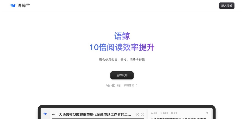 本站 Ai工具集提供的 语鲸官网网址来源于网络,对该网址的指向,不由 Ai工具集实际控制,在 2025年2月20日 下午2:42首发收录时,该网页上的内容,都属于合规合法,后期网页的内容如出现违规,可以直接联系网站管理员进行删除, Ai工具集不承担任何责任。