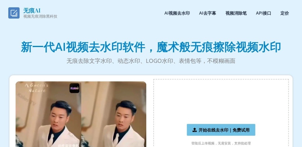 无痕AI是一款在线AI工具,可以无痕去除视频中的各种水印,字幕以及不想要的元素。有别于传统视频去水印,去字幕工具的效果,无痕AI使用视频大模型,视频去除水印、字幕后,画面不模糊,几乎看不出处理痕迹。