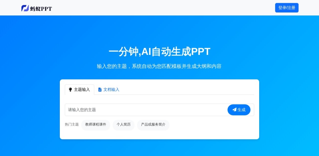 【一句话生成】:只需输入一句话,蚂蚁PPT即可智能生成高质量的PPT内容,助您快速完成演示文稿。