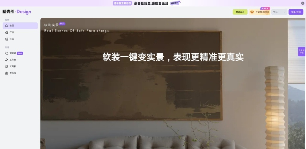 暗壳AI的核心功能围绕“智能体工作台”展开,它整合了超过30种专业设计工具与资源,覆盖了空间设计从概念到视觉化的全过程。