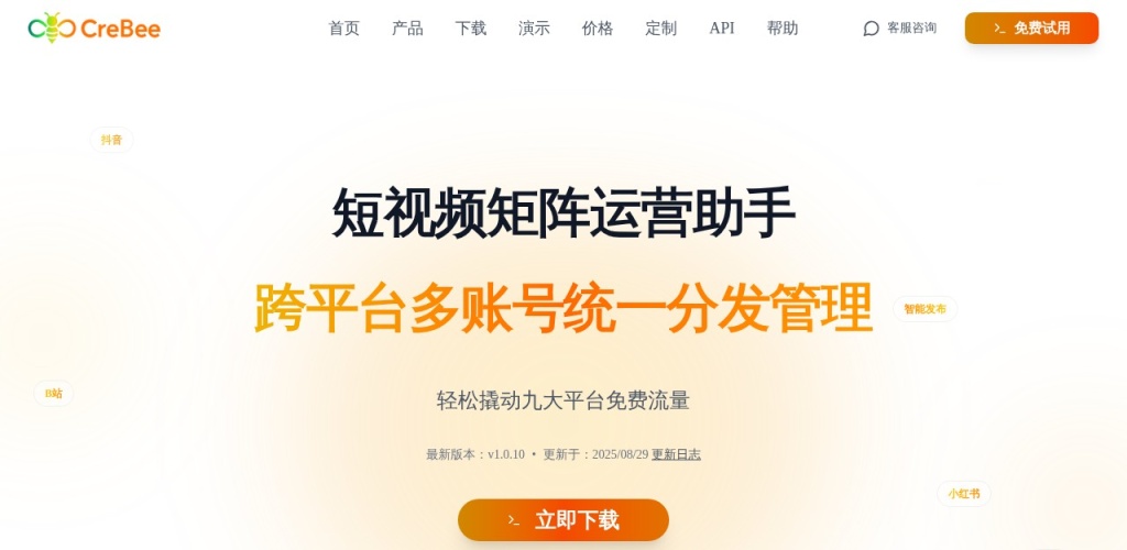 CreBee是一款AI短视频矩阵运营工具,实现了社交媒体跨平台多账号一站式管理,支持一键分发短视频到9大主流社媒平台,自动汇总传播效果数据。