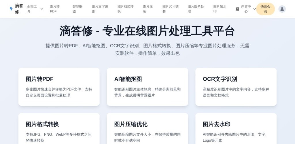 本站 Ai工具集提供的 滴答修-图片处理官网网址来源于网络,对该网址的指向,不由 Ai工具集实际控制,在 2025年9月23日 下午1:57首发收录时,该网页上的内容,都属于合规合法,后期网页的内容如出现违规,可以直接联系网站管理员进行删除, Ai工具集不承担任何责任。