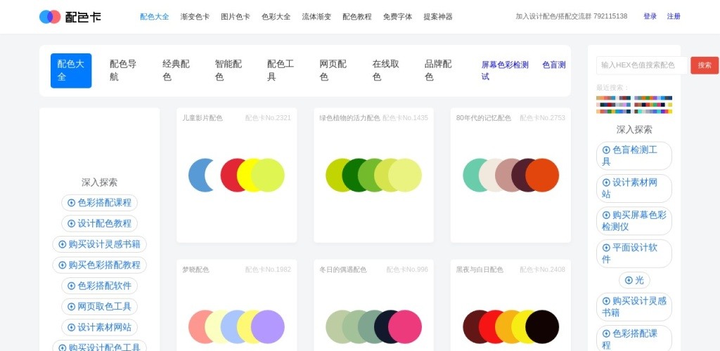 网站拥有一个极其丰富的配色方案库,这些方案被精心分类,例如: