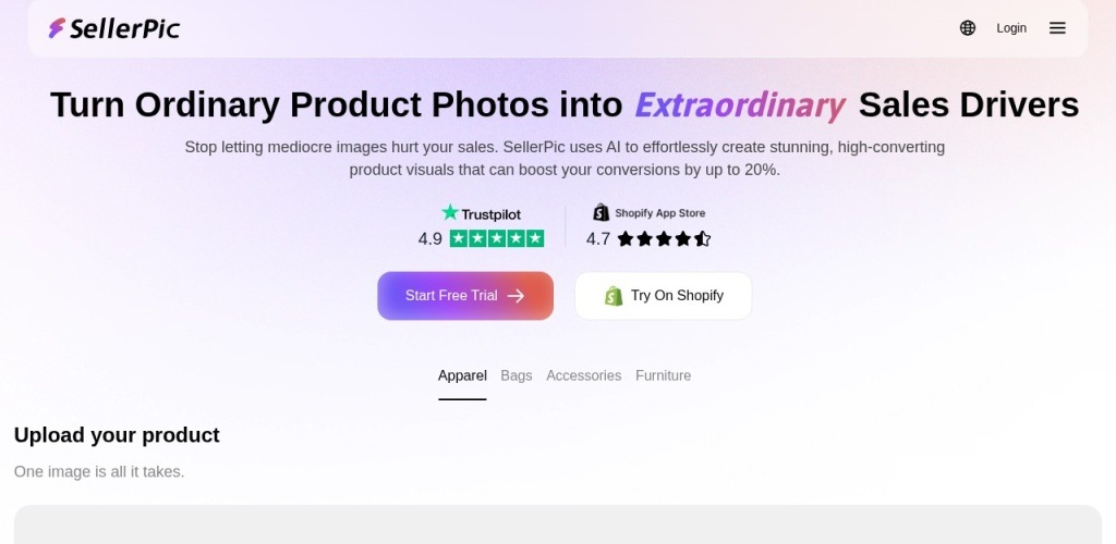 SellerPic针对不同品类产品进行了专项优化。珠宝类产品支持细节增强,家具类支持空间场景合成。建议先使用免费额度测试效果,通常都能达到专业级展示效果。