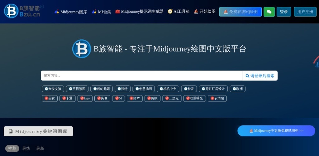 B族AI绘图Midjourney关键词交流服务实用工具平台可以帮助用户快速生成符合需求的Midjourney关键词和咒语,从而提高绘画创作的效率和质量。用户可以根据自己的喜好和需求,选择不同的风格和场景,生成个性化的提示文本。同时,该平台还提供了丰富的成品关键词词组,为用户节省创作时间,让创意无处不在。