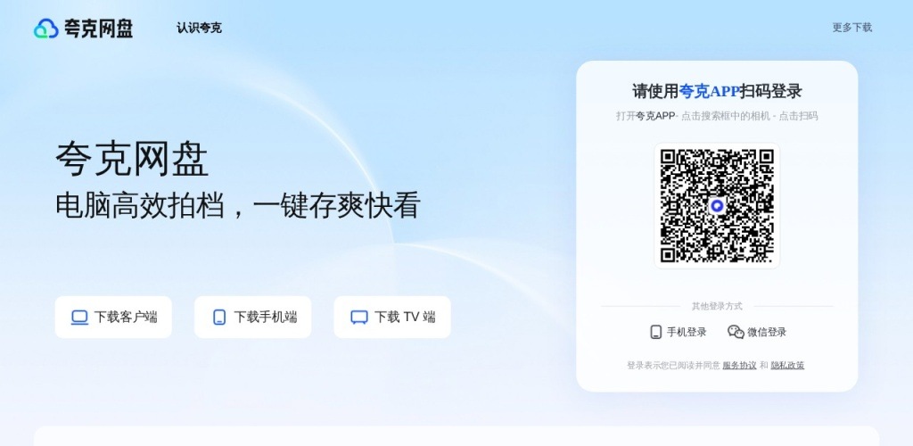 访问夸克网盘官网,你可以直接使用网页版管理文件,或下载各平台客户端。
