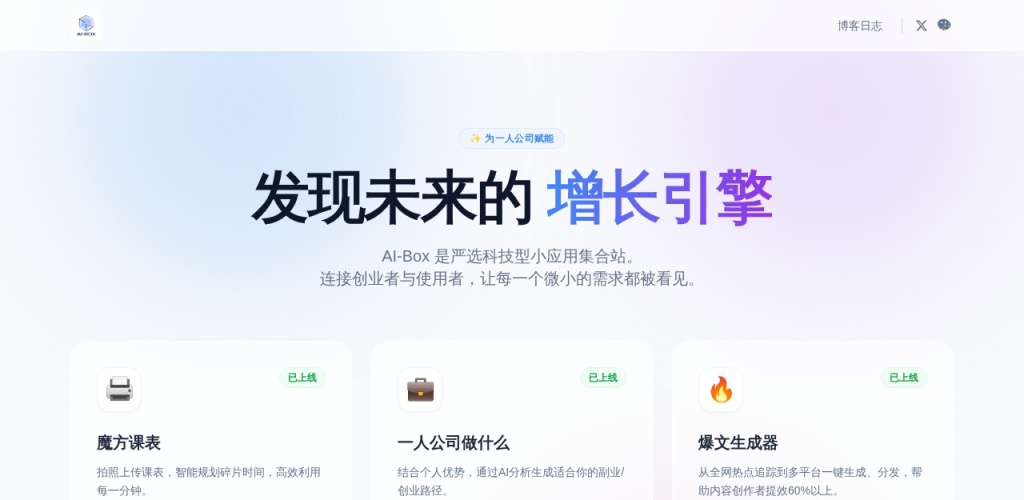 AI-Box 致力于构建以“实用主义”为核心的轻量级 AI 产品矩阵。我们不追求繁琐的功能堆砌,而是深耕细分赛道,利用 Google Gemini 等前沿大模型能力,为用户提供即开即用的效率方案。目前矩阵已成功孵化出:专注于散户决策支持的 “AI 盘面快解”、助力大学生高效自律的 “魔方课表”,以及精准验证赛道潜力的 “一人公司做什么”。无论你是寻找投资灵感的股民,还是探索副业路径的创作者,AI-Box 都能为你提供精准、专业且具备实操价值的智慧支撑,是个人探索 AI 时代高效生产力的“航空母舰”。