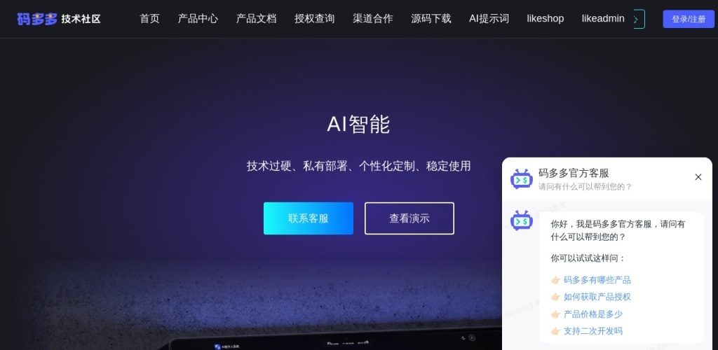 码多多AI是一家专注于人工智能技术的公司,其提供的ChatAI智能聊天系统和ChatWork企业知识库系统均基于人工智能技术,实现了智能对话、AI应用和第三方对接等功能。