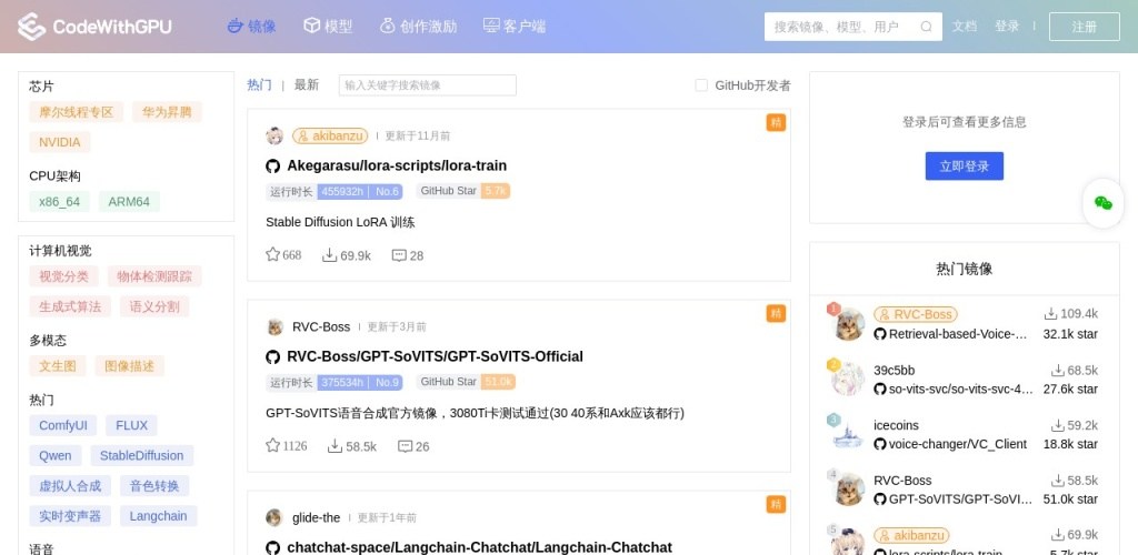 丰富的算法资源:CodeWithGPU 包含了各种 AI 算法的镜像和模型,涵盖了深度学习、计算机视觉、自然语言处理等多个领域。