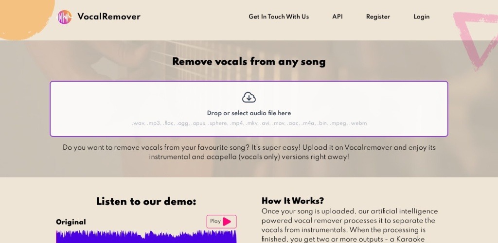 一键操作:用户只需将歌曲上传至Vocal Remover平台,即可一键完成人声去除,无需繁琐的设置和调整,大大提高了工作效率。