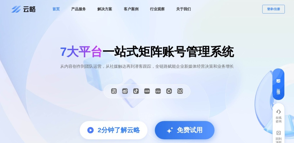 云略-多平台账号矩阵运营管理系统是一款集成了人工智能技术的智能运营工具。它运用先进的AI算法,实现了对企业抖音、快手、视频号、小红书、公众号、微博、B站等七大平台账号数据的监测、分析和优化,帮助企业实现高效的新媒体矩阵运营。