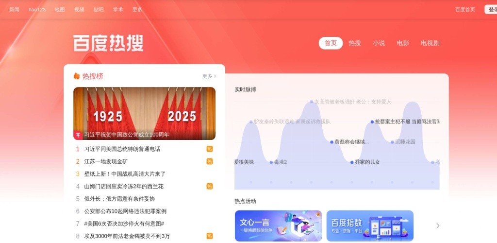 百度热搜以数亿用户海量的真实数据为基础,通过专业的数据挖掘方法,计算关键词的热搜指数,旨在建立权威、全面、热门、时效的各类关键词排行榜,引领热词阅读时代。