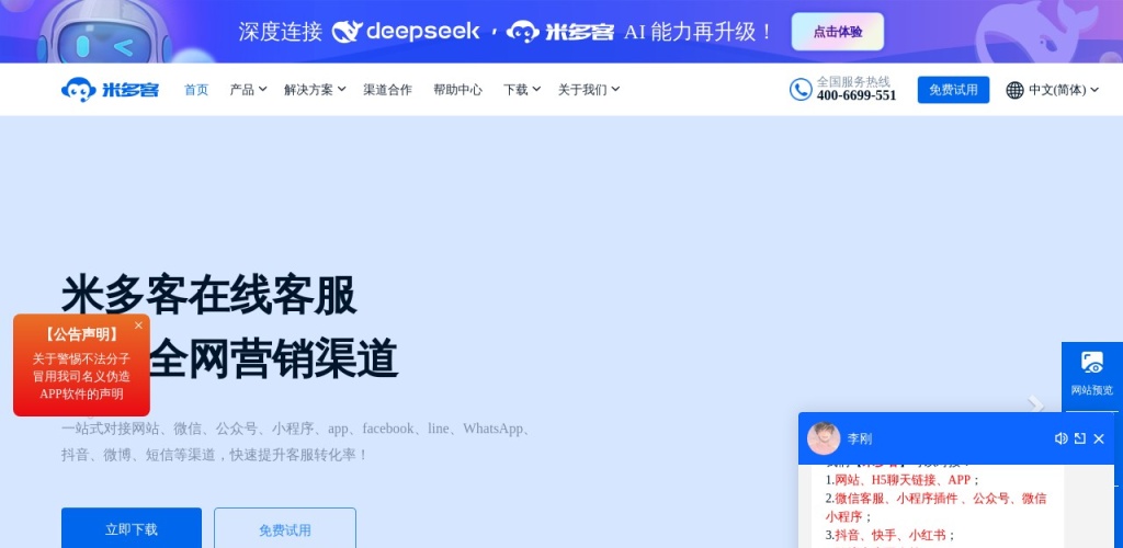 米多客全渠道客服系统是集网站在线客服系统、微信公众号客服系统、微信小程序客服系统等功能于一身的全渠道客服系统,可实现多渠道对话接入,统一对话窗口,统一客服管理界面。