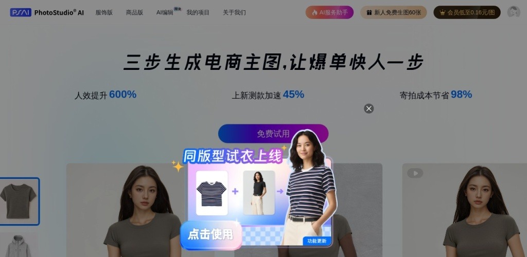 PhotoStudio® AI致力于极低成本、极高效率满足商业拍摄需求。写实高颜值AI模特,海量AI商业场景,专业电商行业AI作图工具,无需下载,简单3步生成超高颜值的AI摄影大片,助力电商商家降本增效!