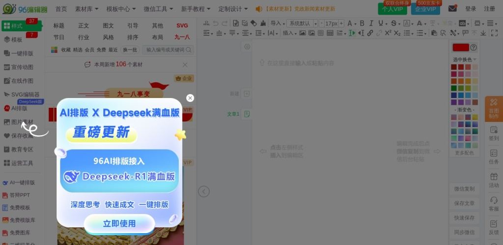 96微信编辑器是一款专为微信公众平台设计的在线编辑排版工具,具有以下特点: