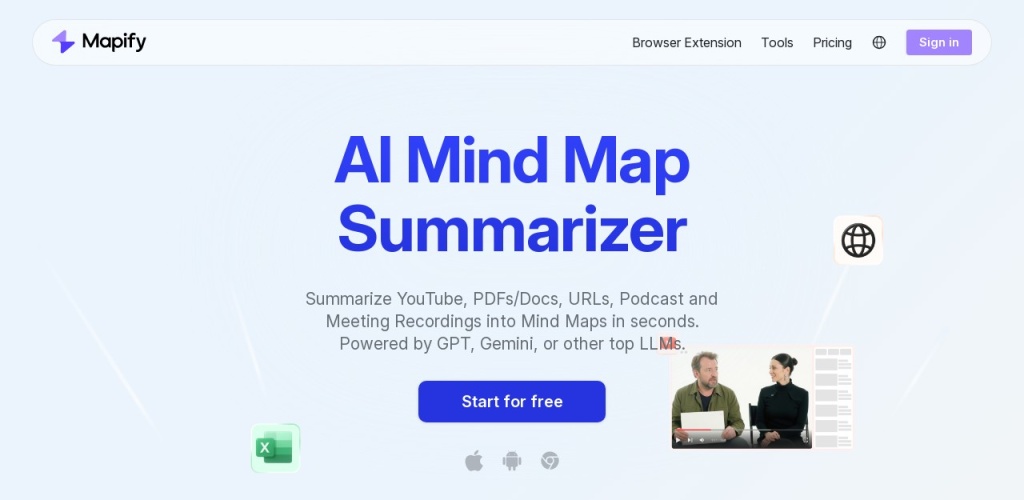 Mapify 是一款集成了人工智能技术的思维导图工具,旨在帮助用户高效地从多样化的信息源中提取关键内容,并将其结构化地呈现出来。这款工具特别适合处理大量信息,并通过直观的可视化方式帮助用户理解和记忆这些信息。Mapify 的一键式操作、智能模板以及高级功能如AI对话和实时网络访问,都极大地提升了用户在使用过程中的便捷性和创造性。其目标用户群包括学生、研究人员、教育工作者、商业分析师和产品经理等,他们通常需要在学习和工作中整理和展示复杂的信息。