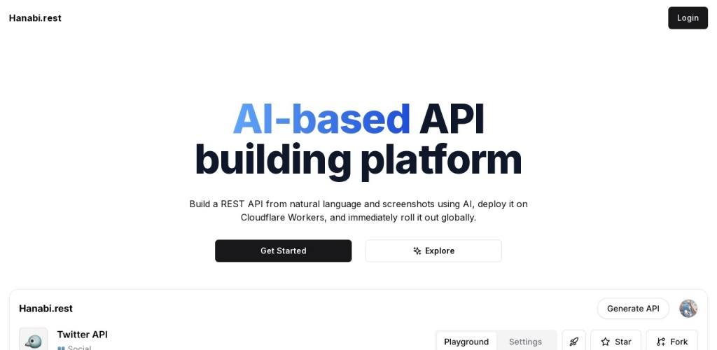 Hanabi.rest是一个基于AI的API构建平台,它允许用户通过自然语言和截图来构建REST API,并且可以立即在全球范围内通过Cloudflare Workers部署。该平台支持多运行时API,能够生成与Cloudflare、Fastly、Deno、Bun、Lagon、AWS或Node.js兼容的代码,非常适合需要快速开发和部署API的开发者。