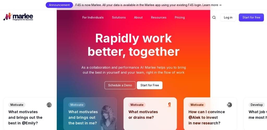 Marlee是一款致力于提升团队协作和个人绩效的AI工具。它通过个性化洞察,帮助团队成员在工作流程中相互促进,提供连接、激励、协作和发展的解决方案。Marlee利用科学支持的问题和分析,以高达98%的可靠性度量48种工作动机,帮助团队成员感到被看见和接受,从而在工作中展现最佳状态。此外,Marlee还提供人才招聘、人才发展、解决冲突、团队绩效和沟通等方面的帮助,以及在并购中预测文化协同的可能性。