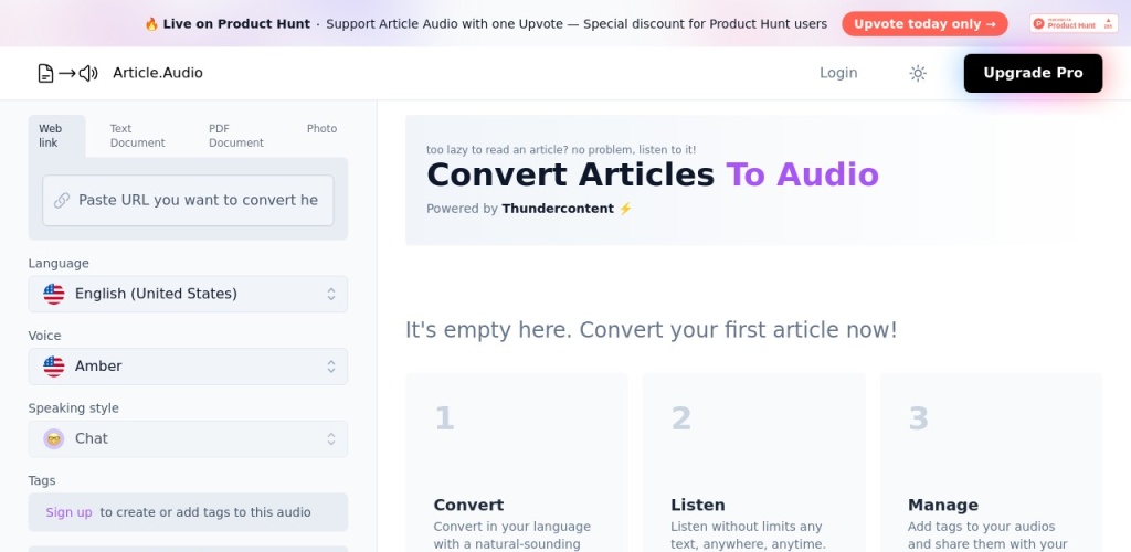 Article.Audio支持粘贴网站链接、上传文本文档、PDF文档或文章的照片作为输入。