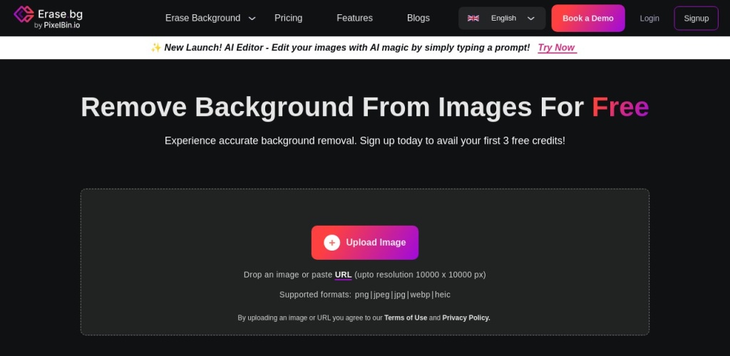 图像上传:用户可以直接上传图像或粘贴URL进行背景去除。工具最高支持5,000 x 5,000 px的分辨率,受支持的格式包括png、jpeg、jpg、webpheic等。