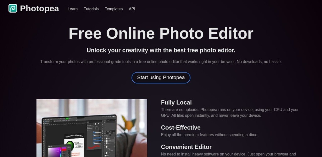 无下载、无安装:Photopea完全在您的设备上运行,使用CPU和GPU,所有文件即时打开,无需离开设备。