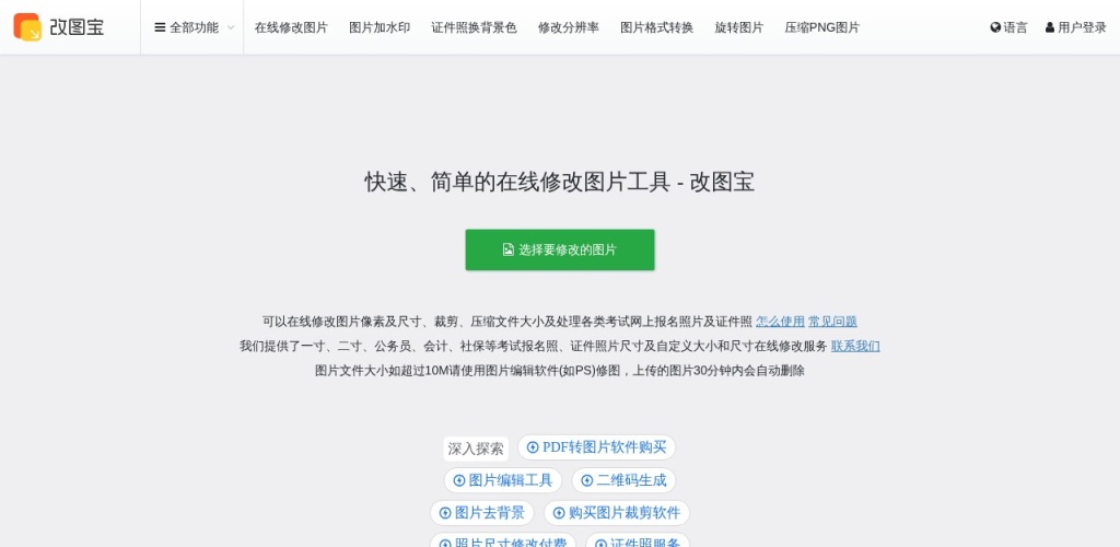 改图宝是一个在线修改图片(照片)大小和尺寸的免费软件,可把上传照片调整或裁剪为一寸、两寸等尺寸,并能对图片进行压缩大小、修改分辨率、旋转、转换格式、加水印等编辑;适用于公务员、英语、计算机、会计、护士、建造师等考试入学网上报名照片和社保、签证等证件照片及微信图片的处理;现在就使用改图宝在线修改图片大小和尺寸吧!