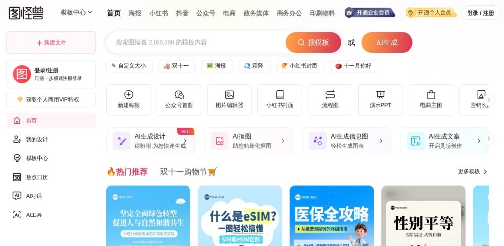 功能特点:图怪兽是一个在线海报编辑器,提供PS图片制作功能,适合个人和商业营销场景。